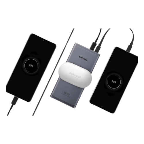 ¿Se te olvidó cargar tu dispositivo móvil? Cálmate, llévate el Samsung PowerBank gris y puedes cargar tu móvil varias veces. Con carga rápida incluida el Battery Pack inalámbrico es compatible con hasta 25 W con carga súper rápida, lo que te proporciona un rápido impulso a través del cable. Más carga, más rápido Lo mejor de todo es que, con su almohadilla inalámbrica y sus dos puertos de carga con cable, puedes cargar hasta tres dispositivos a la vez. Además, es compatible con varios protocolos para que puedas cargar tu teléfono, Galaxy Watch y auriculares con certificación Qi.
